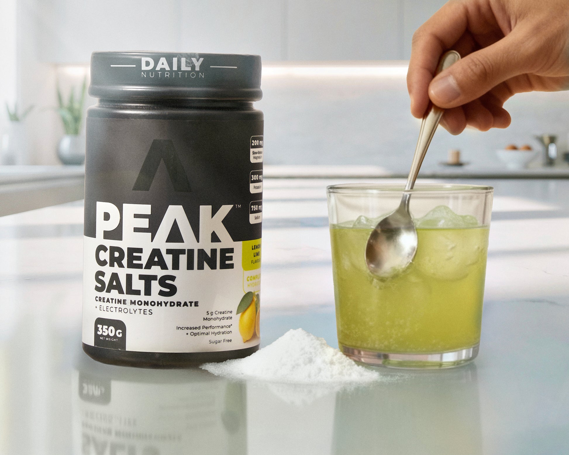 2️⃣ Add 1 round scoop (14g) of PEAK Creatine Salts.